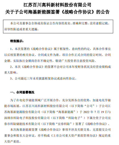 為在電化學儲能領(lǐng)域廣泛開展合作,充分發(fā)揮各自的優(yōu)勢,加速電化學儲能市場拓展, 7月19日,深圳市科陸電子科技股份有限公司下屬全資子公司宜春市科陸儲能技術(shù)有限公司與江蘇海基新能源股份有限公司達成合作共識并簽署了戰(zhàn)略合作協(xié)議。
